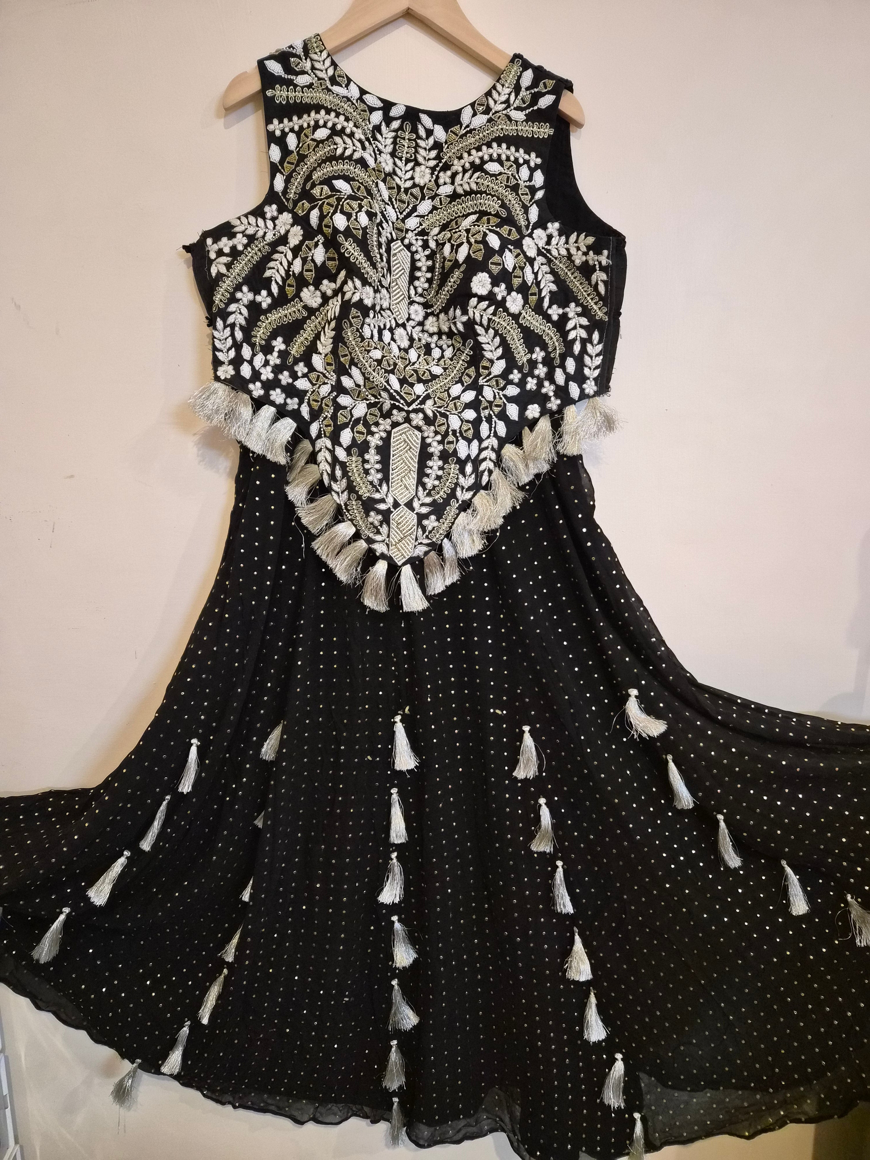Keywords: black indo western lehenga set, embroidered crop top lehenga, tassel back blouse, festive lehenga India, preloved designer lehenga, gold thread beadwork lehenga, party wear indo western outfit