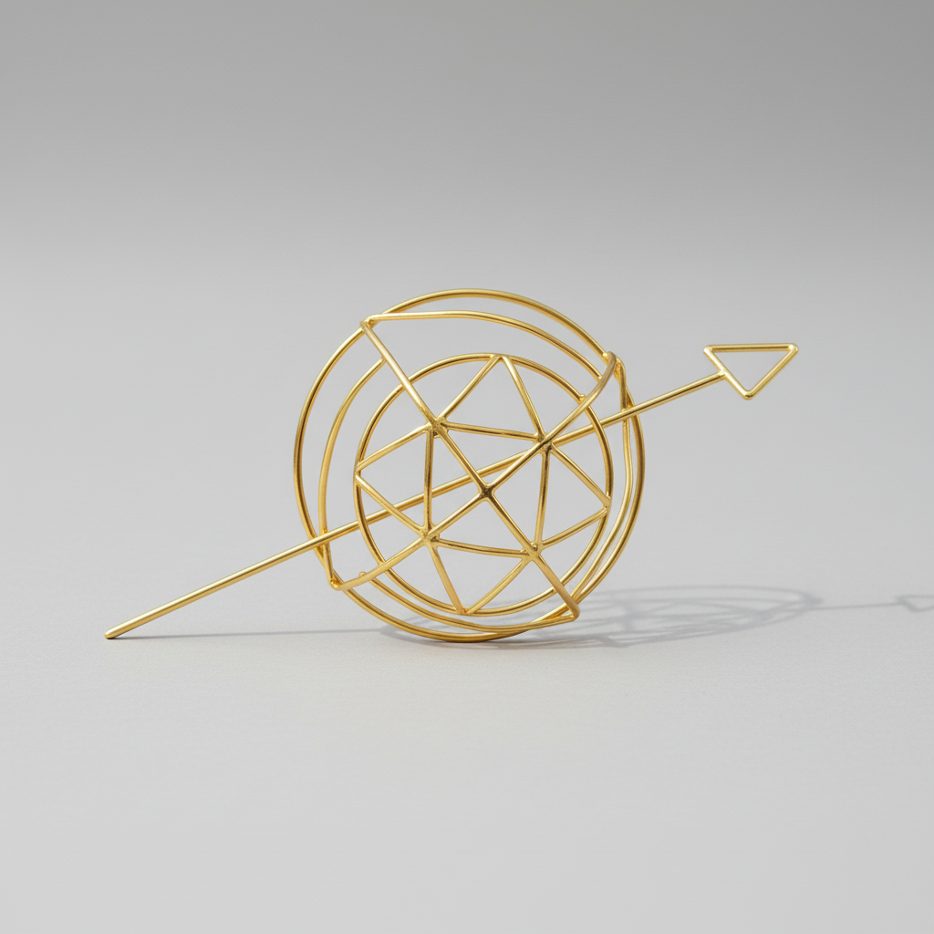 Gold Geometric Hair Bun Pin — a sculptural juda accessory with layered circular rings and clean angular spokes, finished in a rich gold tone. Designed to sit flat over a neat bun, it adds a modern, royal accent to Indian and fusion outfits.