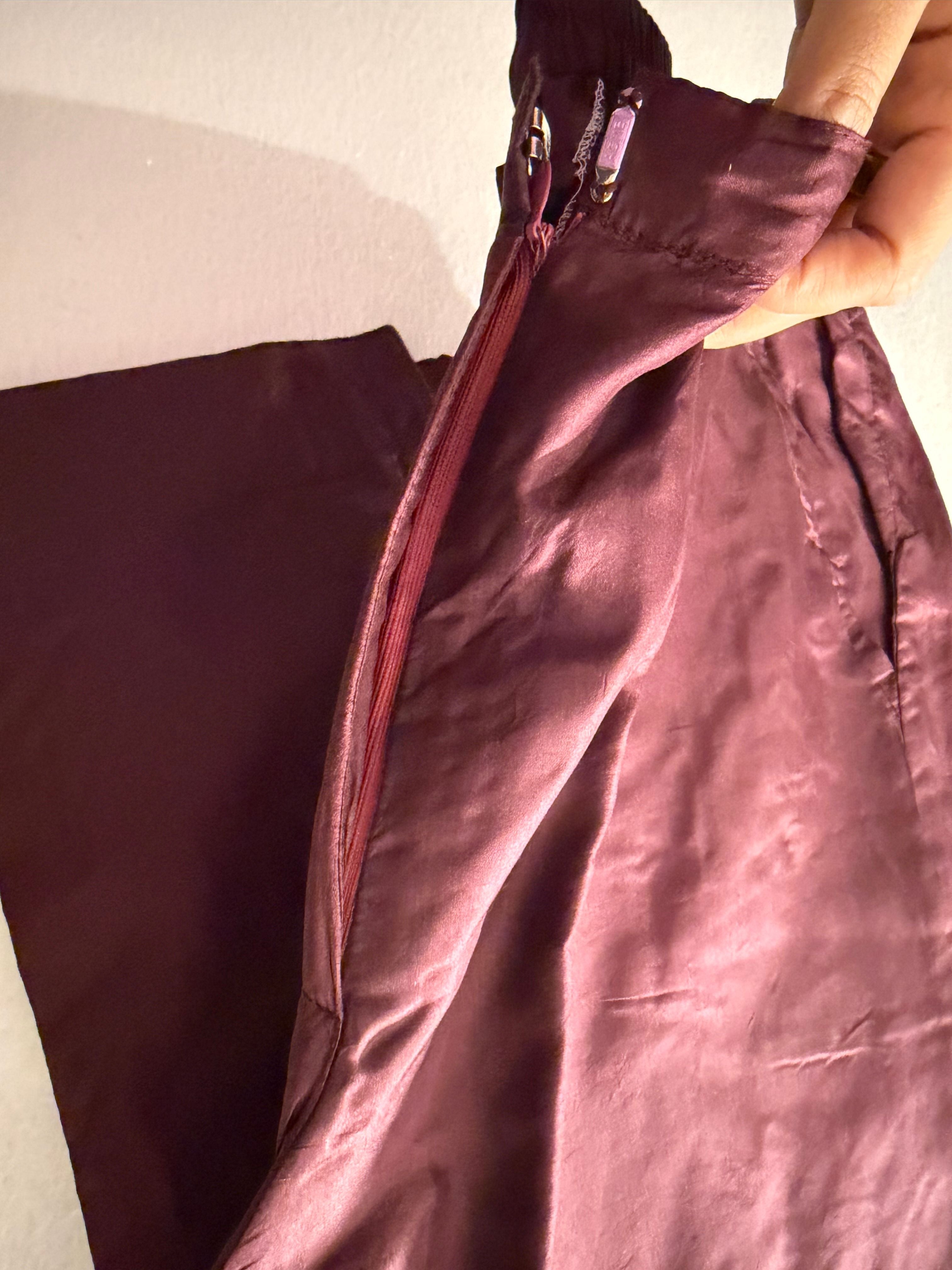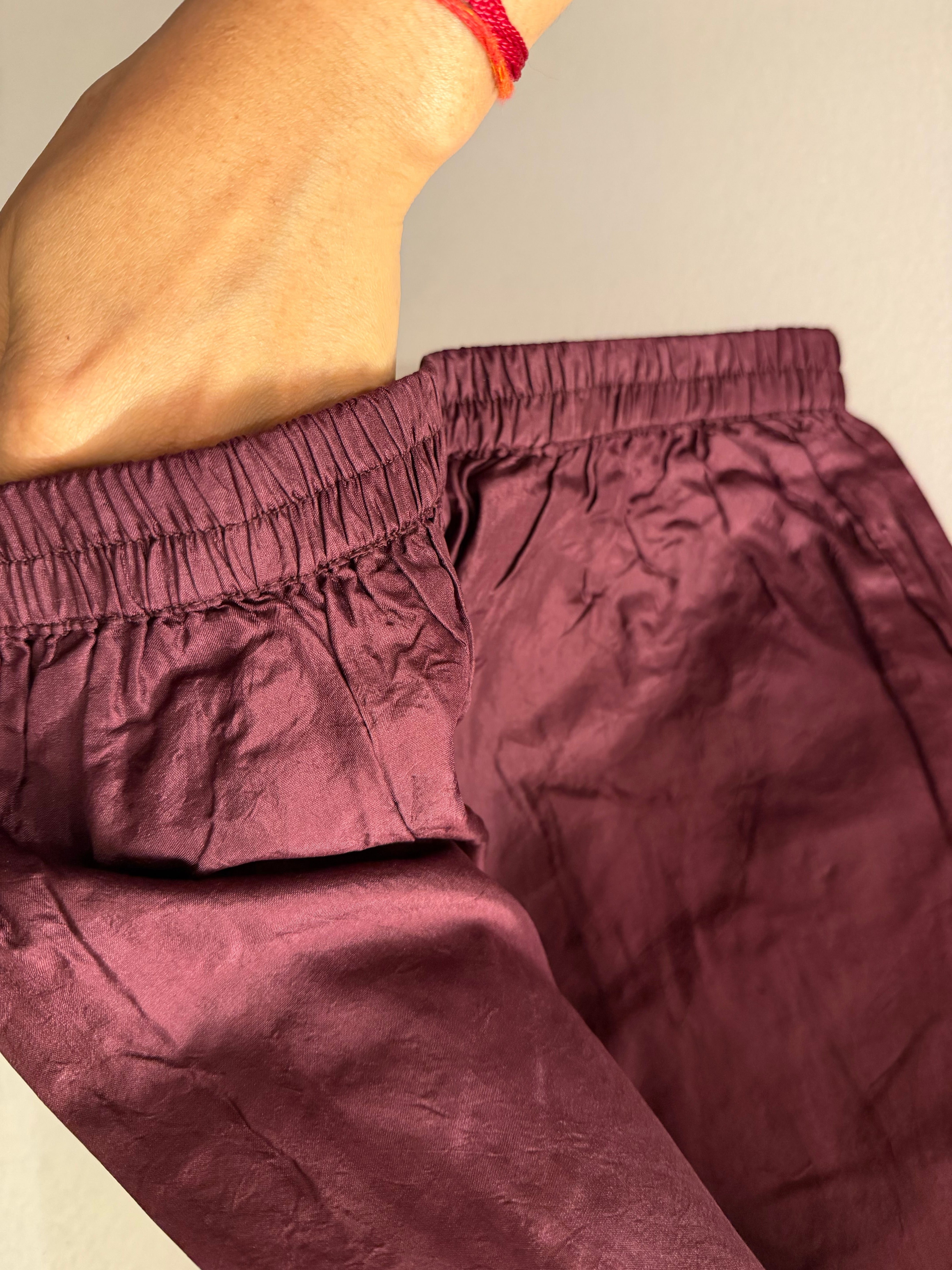 This maroon silk jacket features beautiful brocade work, creating a regal look perfect for Indo-Western styling. It is accompanied by matching pants and a bustier, offering a complete ensemble.