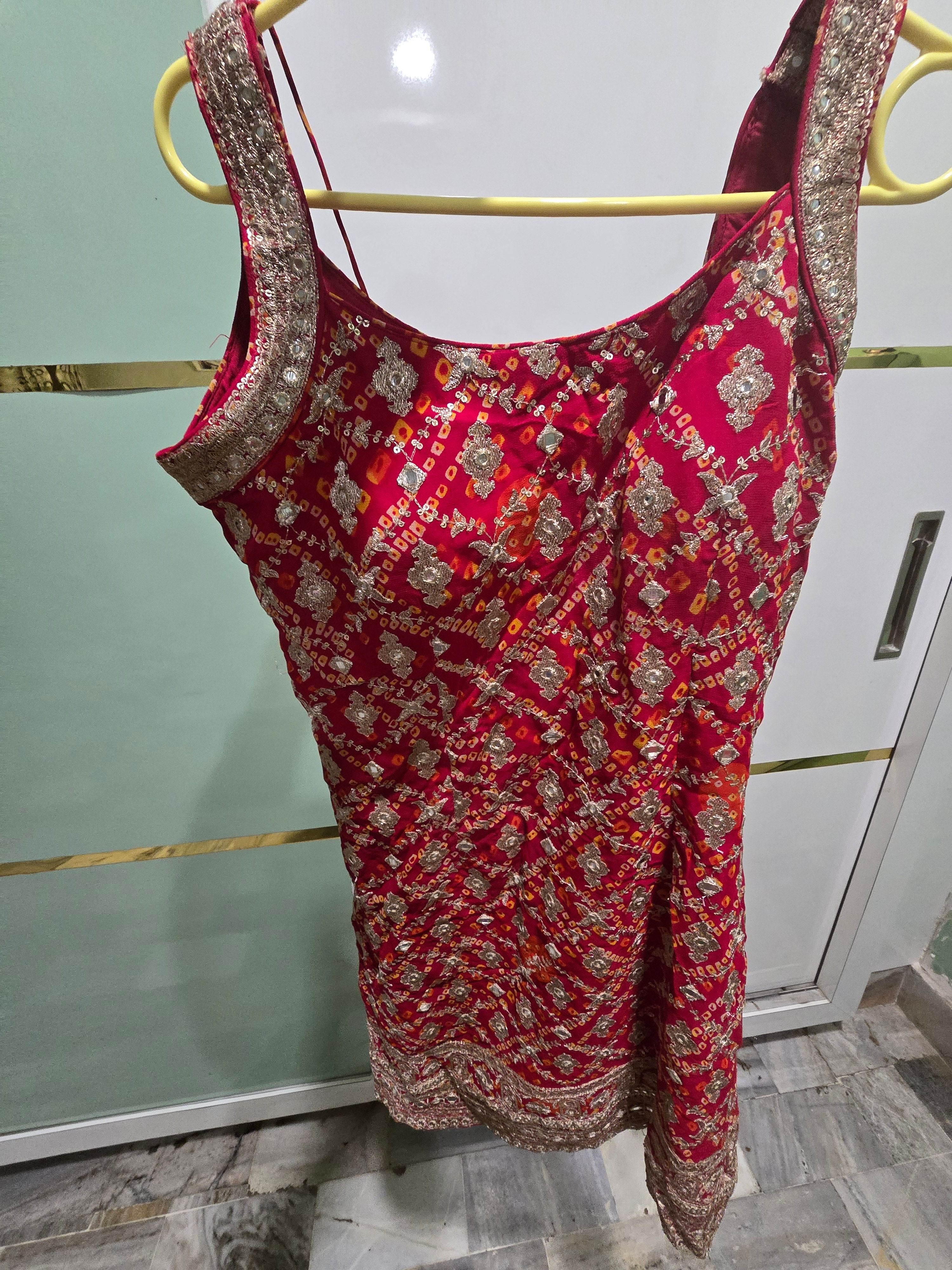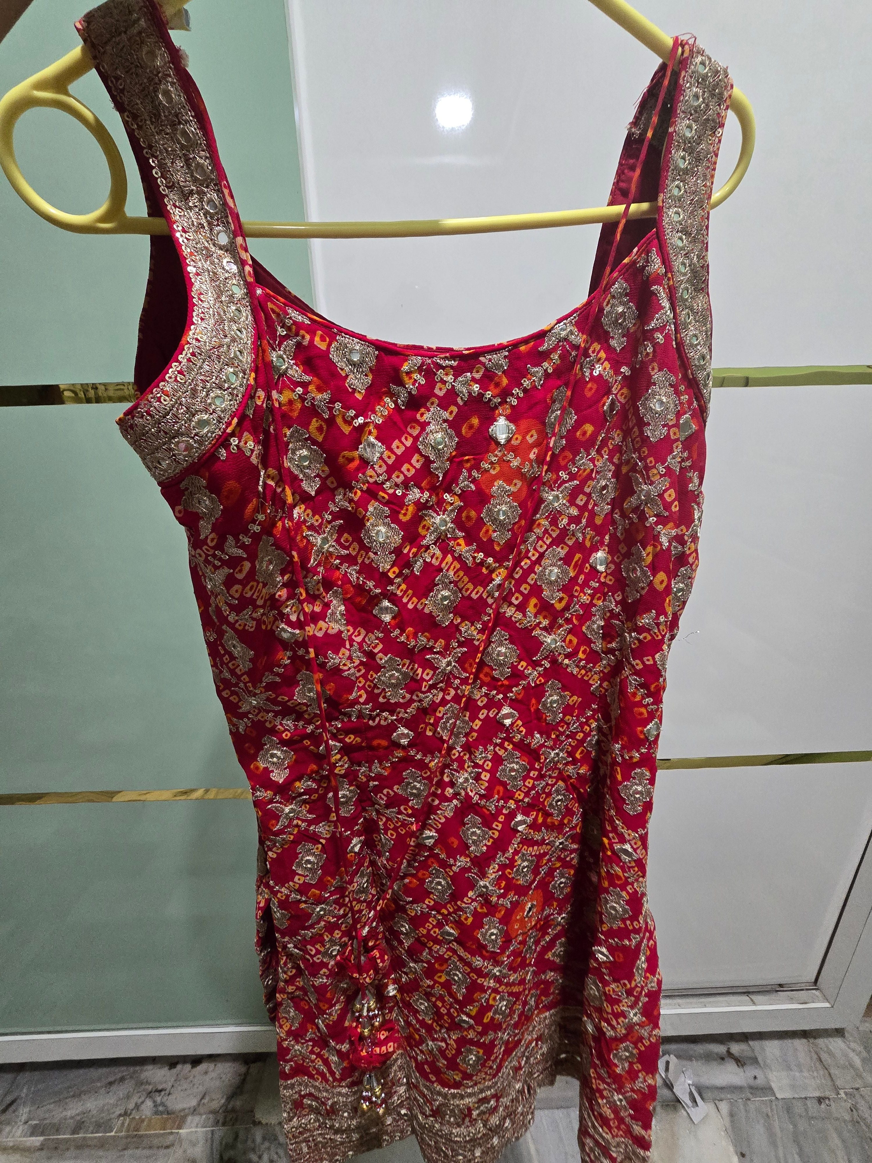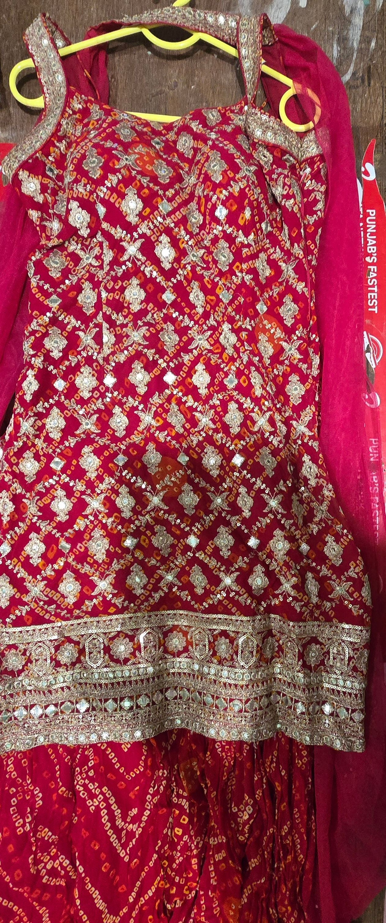 Keywords: maroon jaipuri print suit, georgette sharara set, tilla work anarkali, Rajasthani sharara India, preloved designer suit, festive wedding outfit, bandhej sharara with dupatta, ethnic wear Punjab