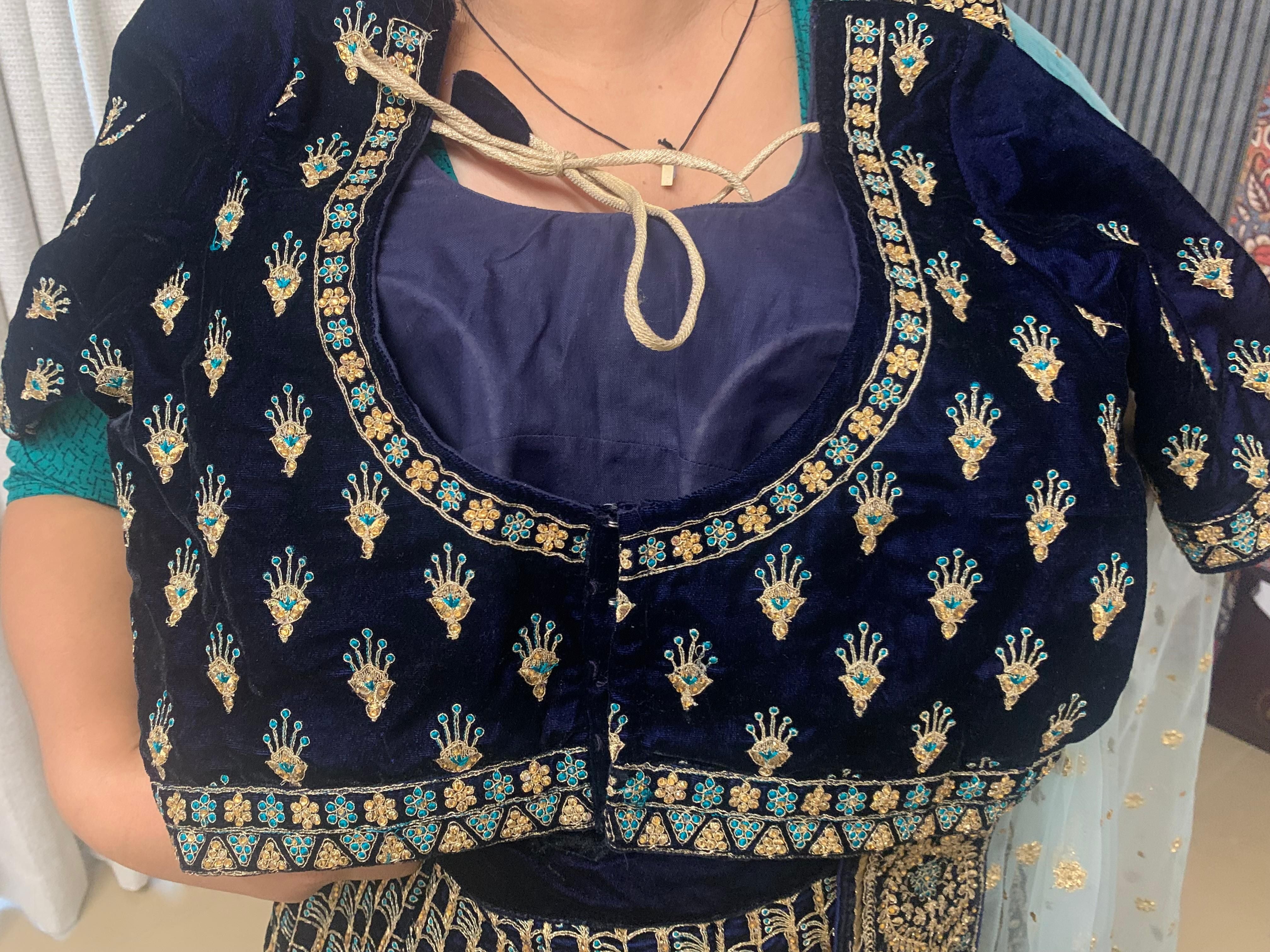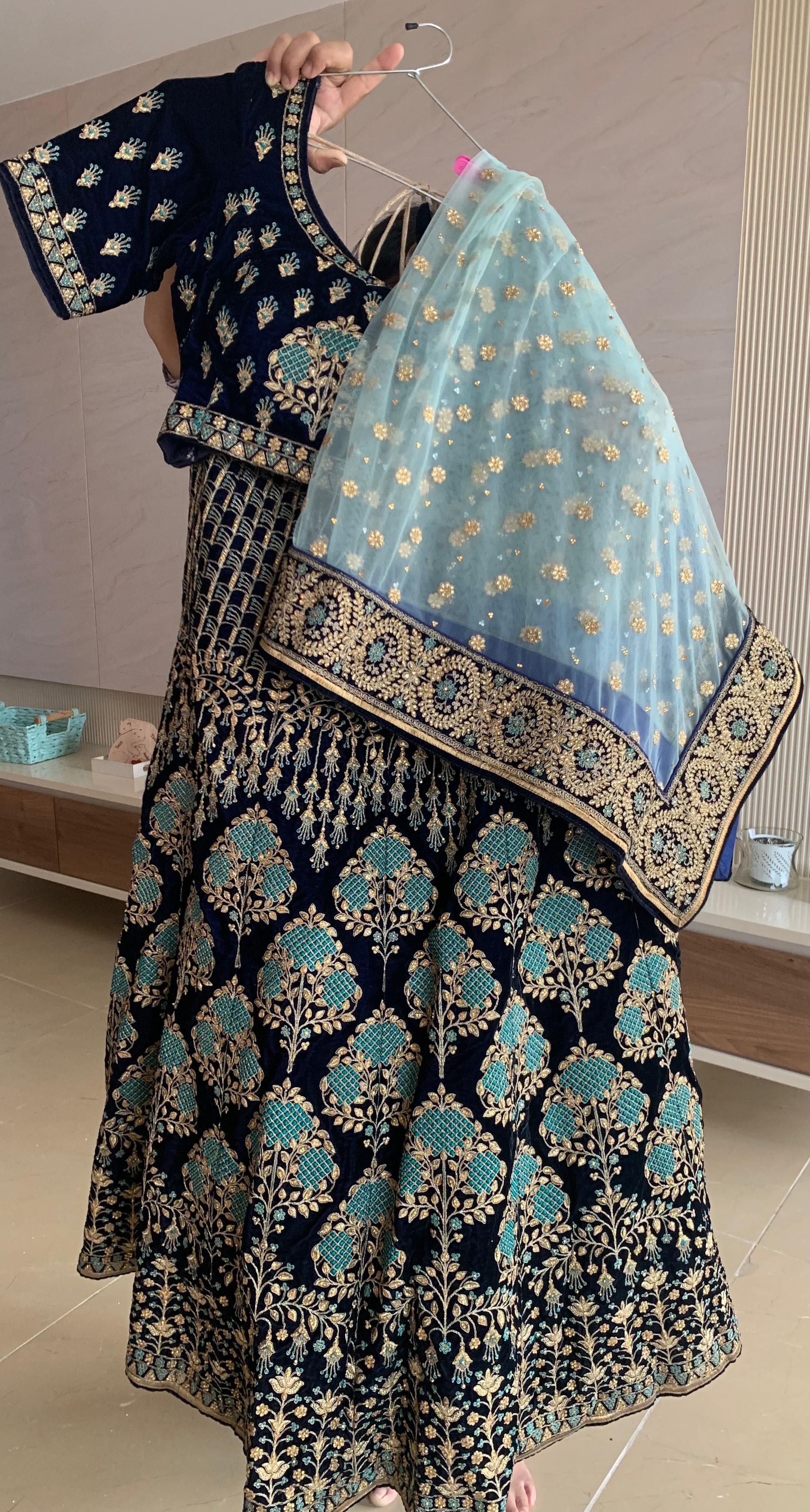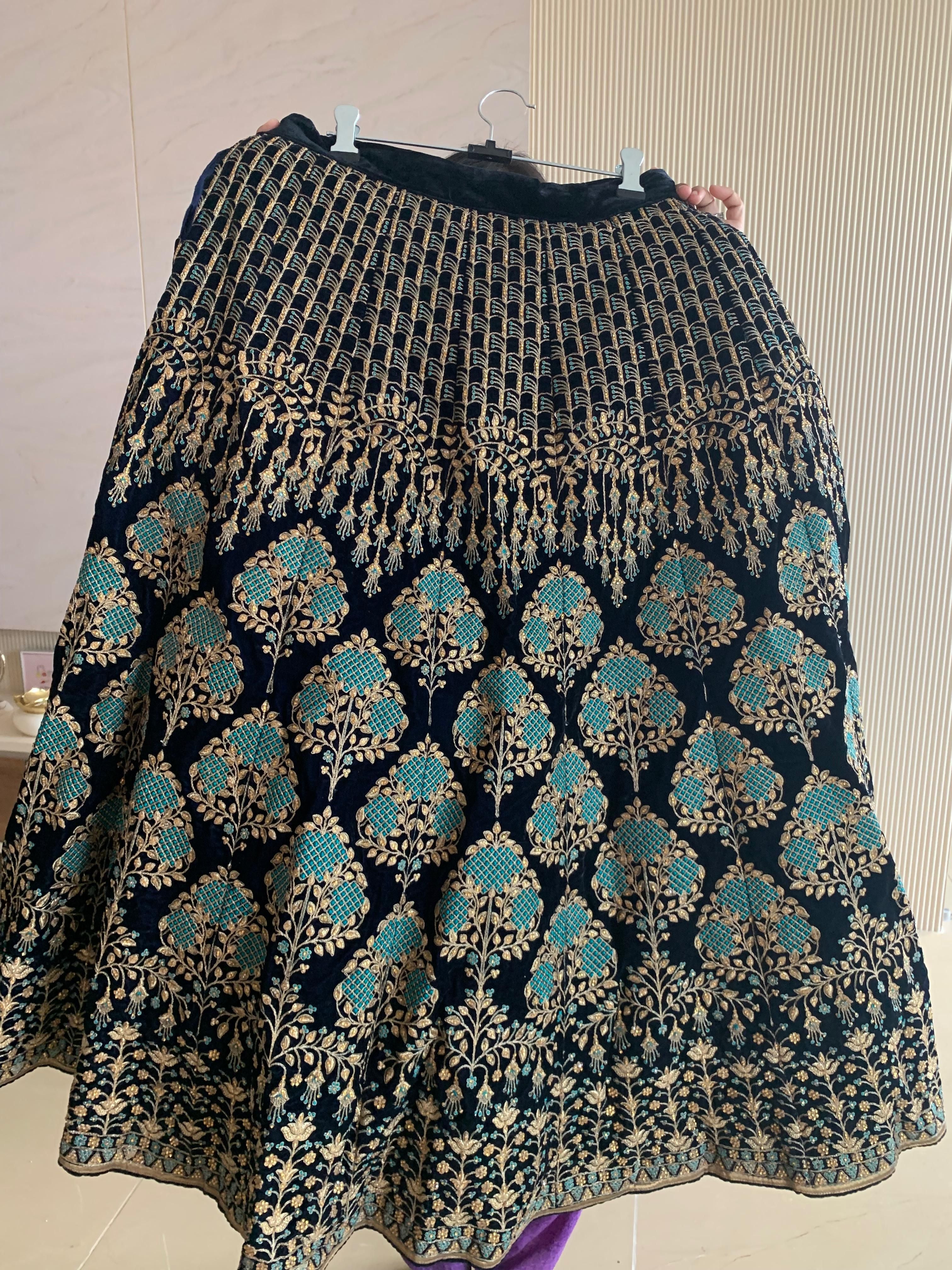 Keywords: navy blue velvet lehenga, embroidered lehenga choli, teal and gold lehenga, bridal guest outfit India, festive lehenga set, designer-style velvet lehenga, size M lehenga, Ahmedabad preloved lehenga